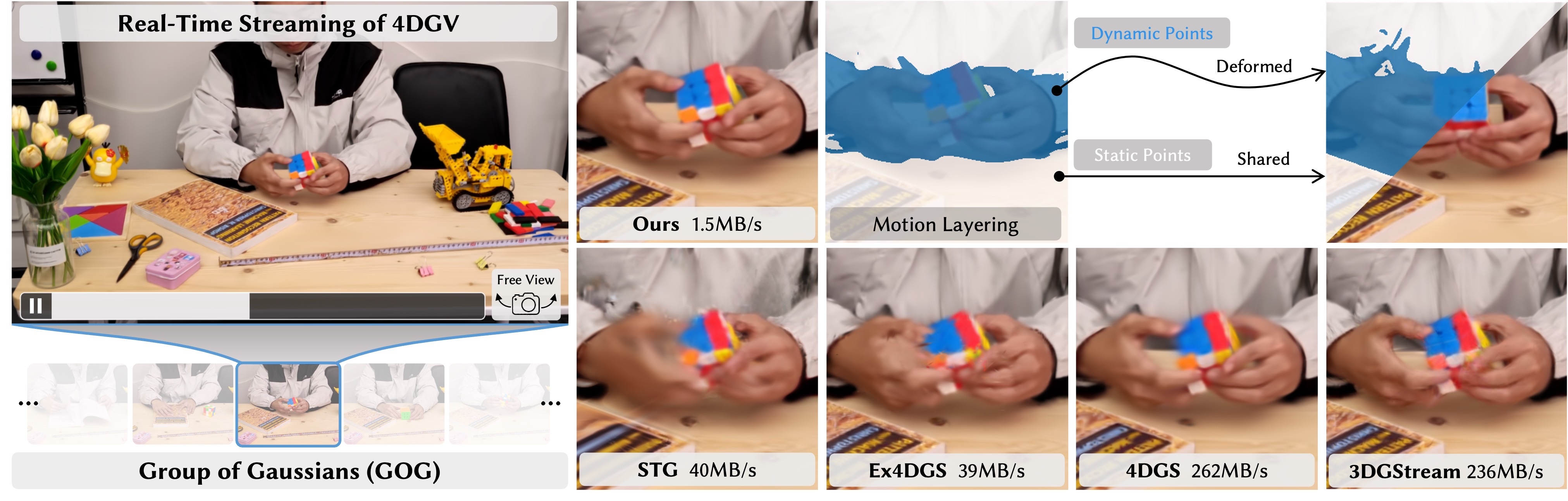 Online free-view navigation in volumetric videos requires high-quality rendering and real-time streaming in order to provide immersive user experiences. However, existing methods may not handle dynamic scenes with complex motions, and their models (e.g., dynamic NeRF and 3DGS) may not be streamable due to storage and bandwidth constraints. In this paper, we propose a novel 4D Gaussian Video (4DGV) approach that enables the creation and streaming of photorealistic, volumetric videos for dynamic scenes over the Internet. The core of our 4DGV is a novel streamable group of Gaussians (GOG) representation based on motion layering. Each GOG consists of static and dynamic points obtained via lifting 2D segmentation into 3D in motion layering, where the deformation of each dynamic point is represented as the temporal offset of its attributes. We also adaptively convert static points back to dynamic points to handle the appearance change, (e.g. moving shadows and reflections), of static objects through optimization. To support real-time streaming of 4DGV, we show that by applying quantization on Gaussian attributes and H.265 encoding on deformation offsets, our GOG representation can be significantly compressed (to around 6% of the original model size) without sacrificing the accuracy (PSNR loss less than 0.01dB). Extensive experiments on standard benchmarks demonstrate that our method outperforms state-of-the-art volumetric video approaches, with superior rendering quality and minimum storage overheads.