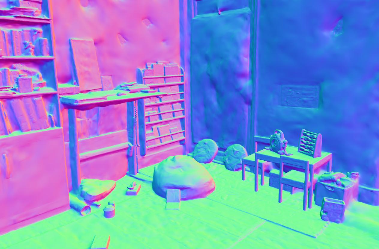 Learning progress of color, normal and depth from random initialization to 15k iterations in 5 minutes.